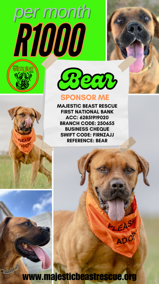 Hey there, I’m Bear, a special boy with a zest for life! I’m all about those daily runs, playing ball, and enjoying tummy rubs and cuddles. I’m sweet and gentle, but watch out, I’m a bit of an escape artist. Got a high fence and a playful heart? Let’s be best buds!