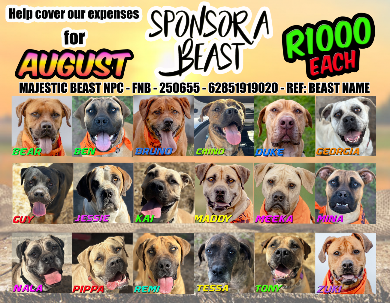 Sponsor a Beast Monthly we have expenses to care for our beasts which includes Accommodation per beast that covers our Rent, Food and Tick & Flea Treatment As you may or may not know we do not receive any government funding thus we solely rely on donations from the public to look after the rescue beasts in our care by providing them with shelter, food and tick & flea treatment to prevent illness' that could arise from tick bites or flea infestations.