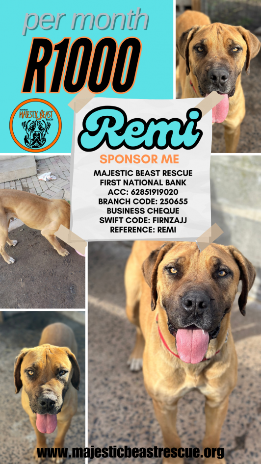 My name is Remi a young Boerboel male between 10 & 15 months who was found along with my mom Raya by community members in Calvinia where we were left to die after our owner moved and clearly no longer wanted us. Our founders then contacted Majestic to help get us back in shape and into loving homes once ready. I was more fortuante than my mom who was tied up, I could dig a hole underneath the fence to go and find food in the streets and play with the community kids. I am still growing and very playful.